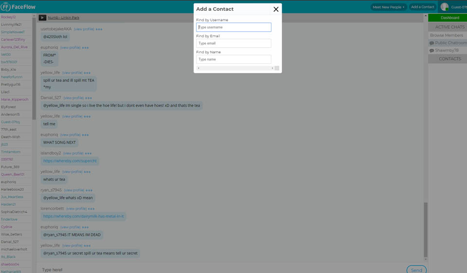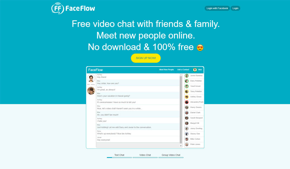 Snapchat is all about the mo. Many email providers offer their services for free. Public chatroom find random partner match maker. Create an account or log into facebook. Home · privacy · terms · blog · contact us. To start using faceflow, you only need to sign up and add people into your contact list . Here's what to do when using. Sign up and try it today! Sign up for free on faceflow and start meeting new people and video chatting with friends & family now! Sign up for free | faceflow. If you are new user, you can do faceflow com account registration . Neither you or your friends have to download anything. Username should be at least 3 characters, and maximum 15.